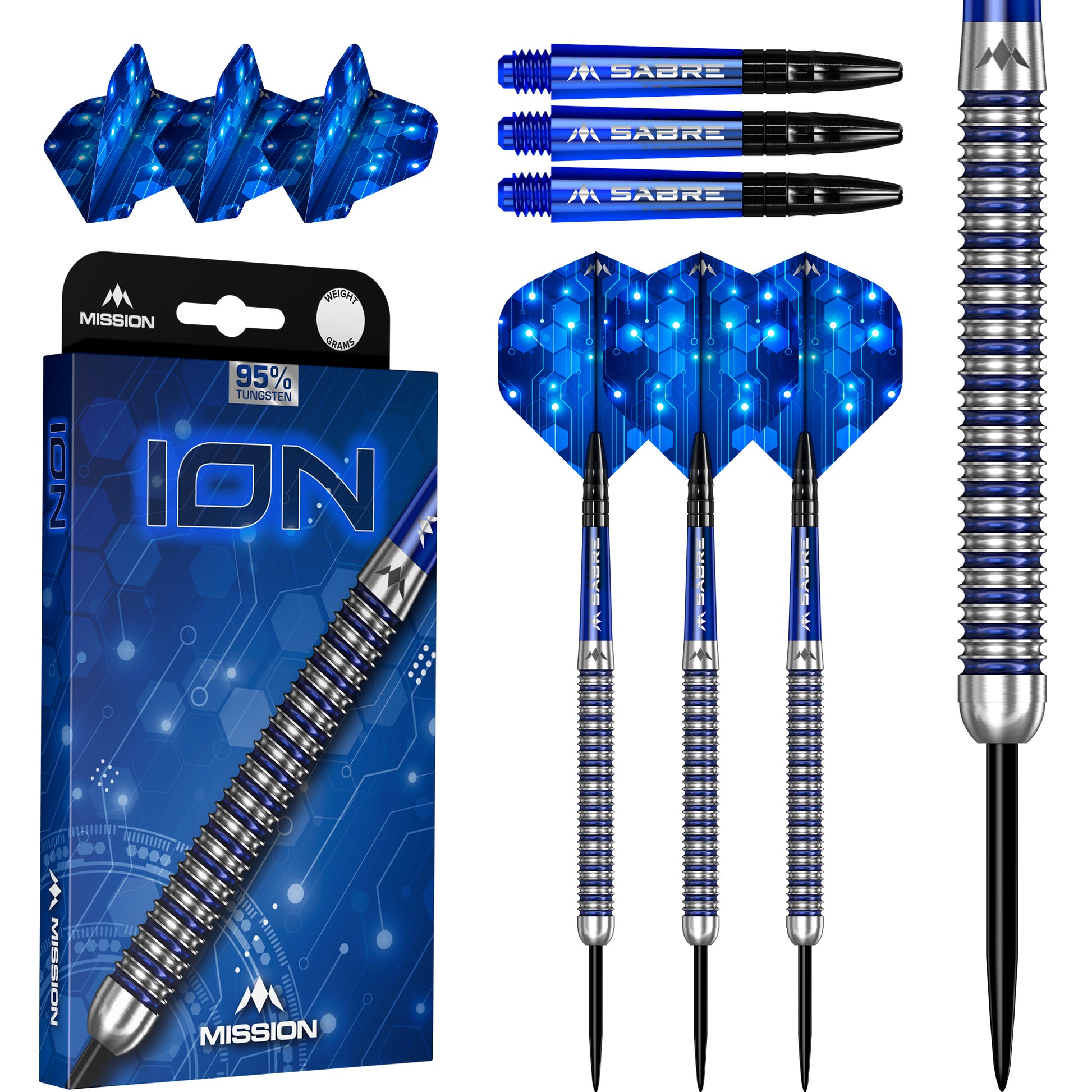 Charge your way to the top with the Mission ION Darts! Inspired by one of Mission’s best-selling tungsten darts, the ION dart is made of a premium 95% tungsten material and is complete with a striking blue PVD coating. A lengthy section of aggressive grip is interspersed with a natural finish and a blue PVD coating within the ringed cuts, with a smooth bull nose of the barrel leading to a smooth black point. A small smooth rear section of the barrel includes the laser-etched Mission logo. The ION dart is complete with a set of short blue Mission Sabre shafts with black tops which tightly grips the signature Mission ION flights.