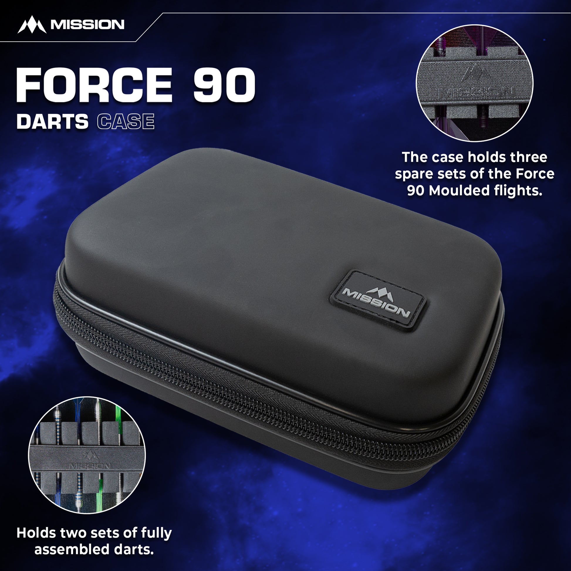 This darts case can hold two sets of fully assembled darts on one side, along with a specifically designed compartment on the other side to hold spare Mission Force 90 flights. Darts and flights are not included.